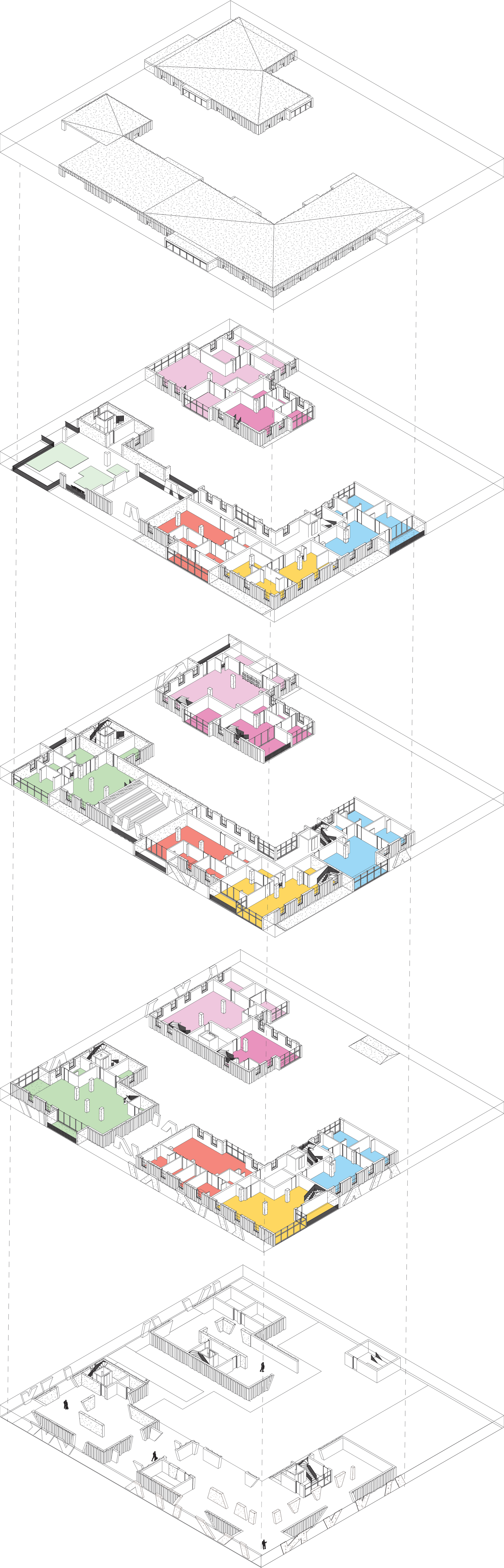 The ground plane is given to circulation, structure, and interaction, while the upper levels include different apartment layouts, auditorium seating, and a rooftop garden.
